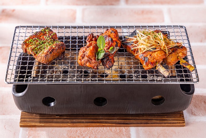 テーブル上にセットされた小さなグリルの炭火で、ゆったり焙りながらいただけますよ。