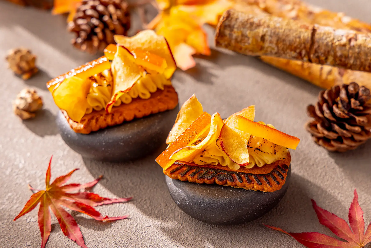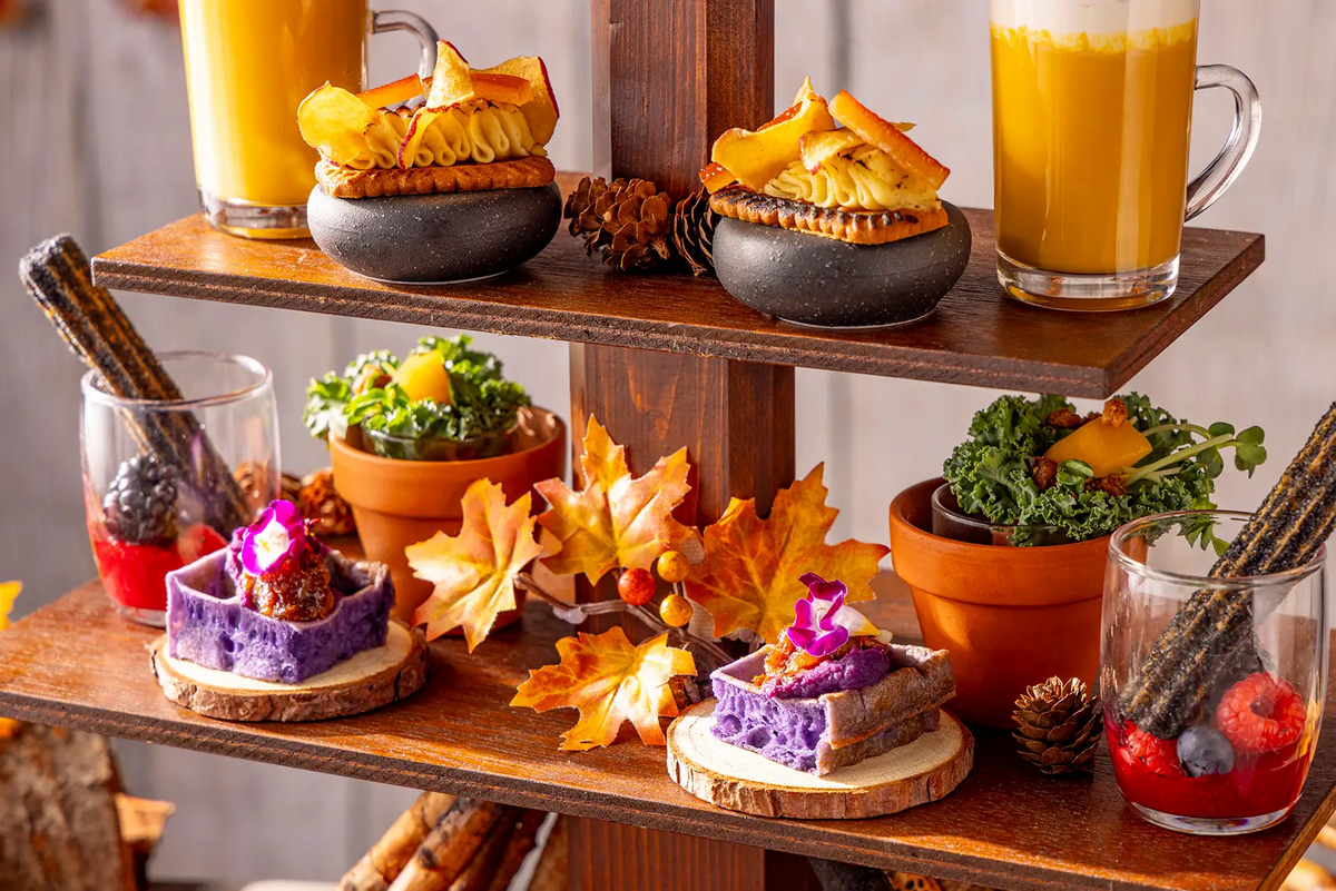 デザートには、シナモンビスケットにスイートポテトのクリームを乗せをのせた「ベイクドスイートポテトタルトレット」や、炭のような色合いの「竹炭シナモンチュロス ベリーコンポート」など全3種類が登場。