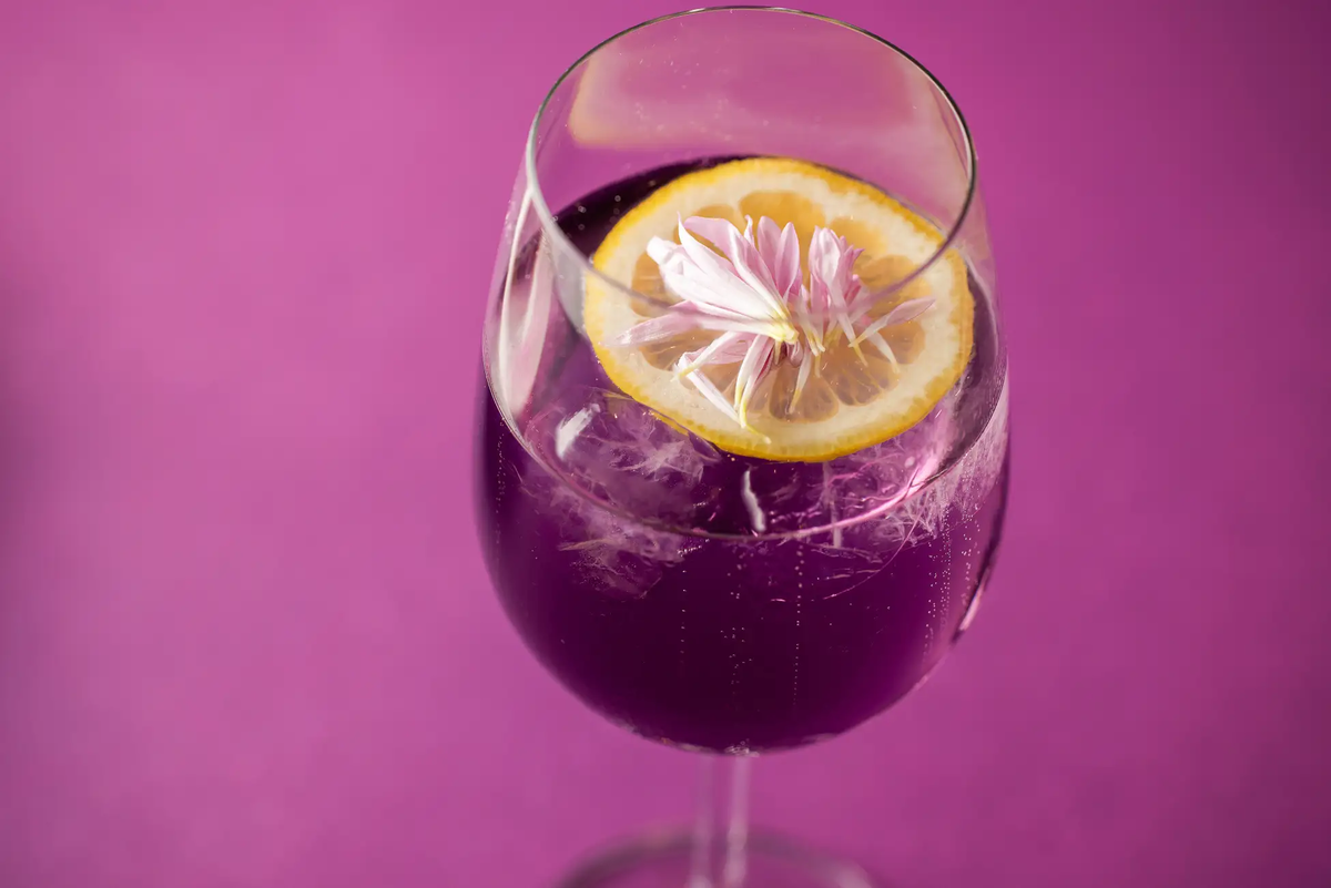 ドリンクには、ヴァイオレットリキュールにアーモンドやローズのシロップを重ね、レモンの酸味でさっぱり仕上げた「Purple Memory(パープル メモリー)」が登場。