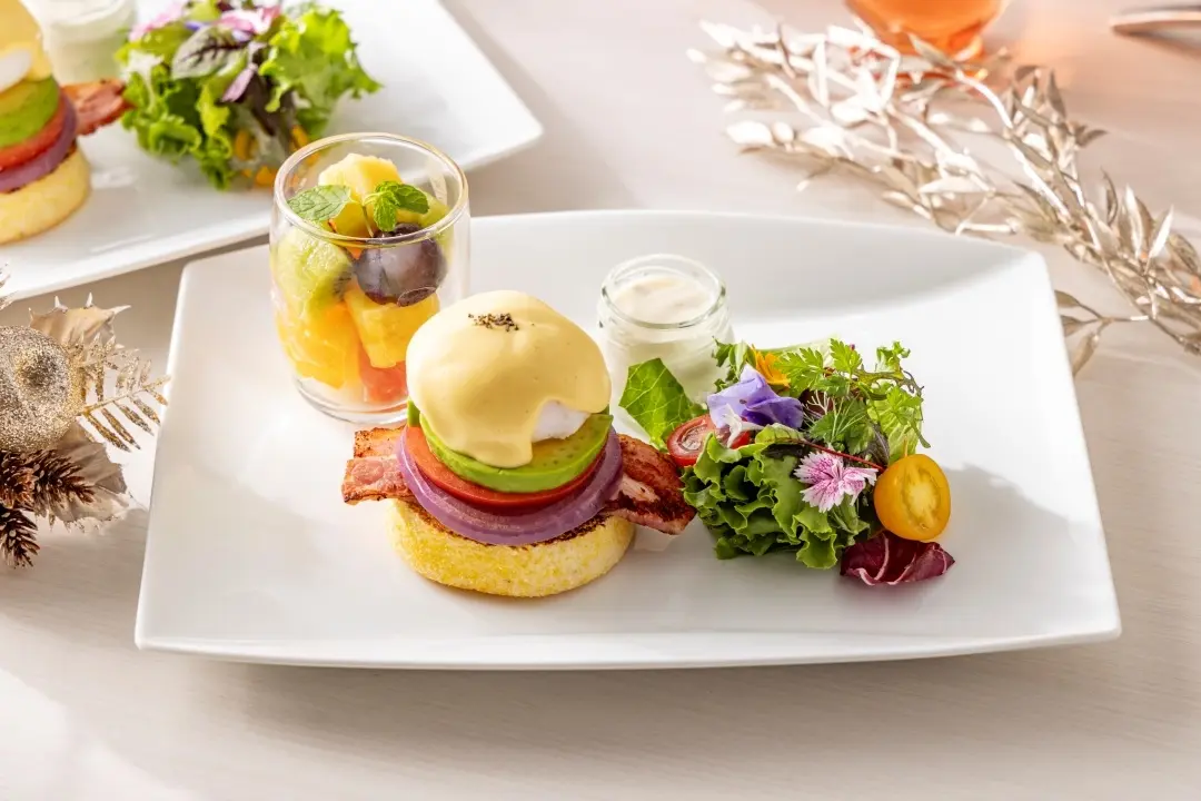 「クリスマスモーニングハイティー」には、クリスマスをテーマにしたスイーツ8種とスコーンに加え、エッグベネディクトやサラダなど、朝にぴったりのセイボリー3種が用意されています。