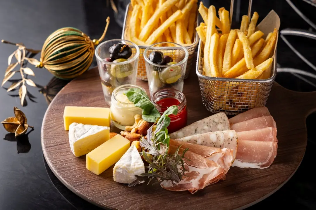 「クリスマスイブニングハイティー」には、クリスマスをテーマにしたスイーツ8種とスコーンに加え、シャルキュトリーやチーズ、トリュフポテトなど、ワインにも合うセイボリー6種が用意されています。