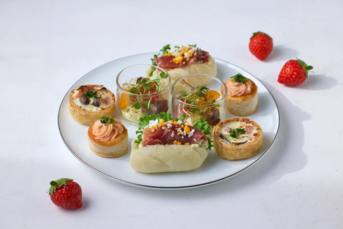 セイボリーには、ミモザを思わせる彩りが華やかな「ポテトサラダと生ハムのドッグサンド」や、軽やかな口あたりのパイ生地が引き立てる「サーモンムースのボローバン」などが登場。