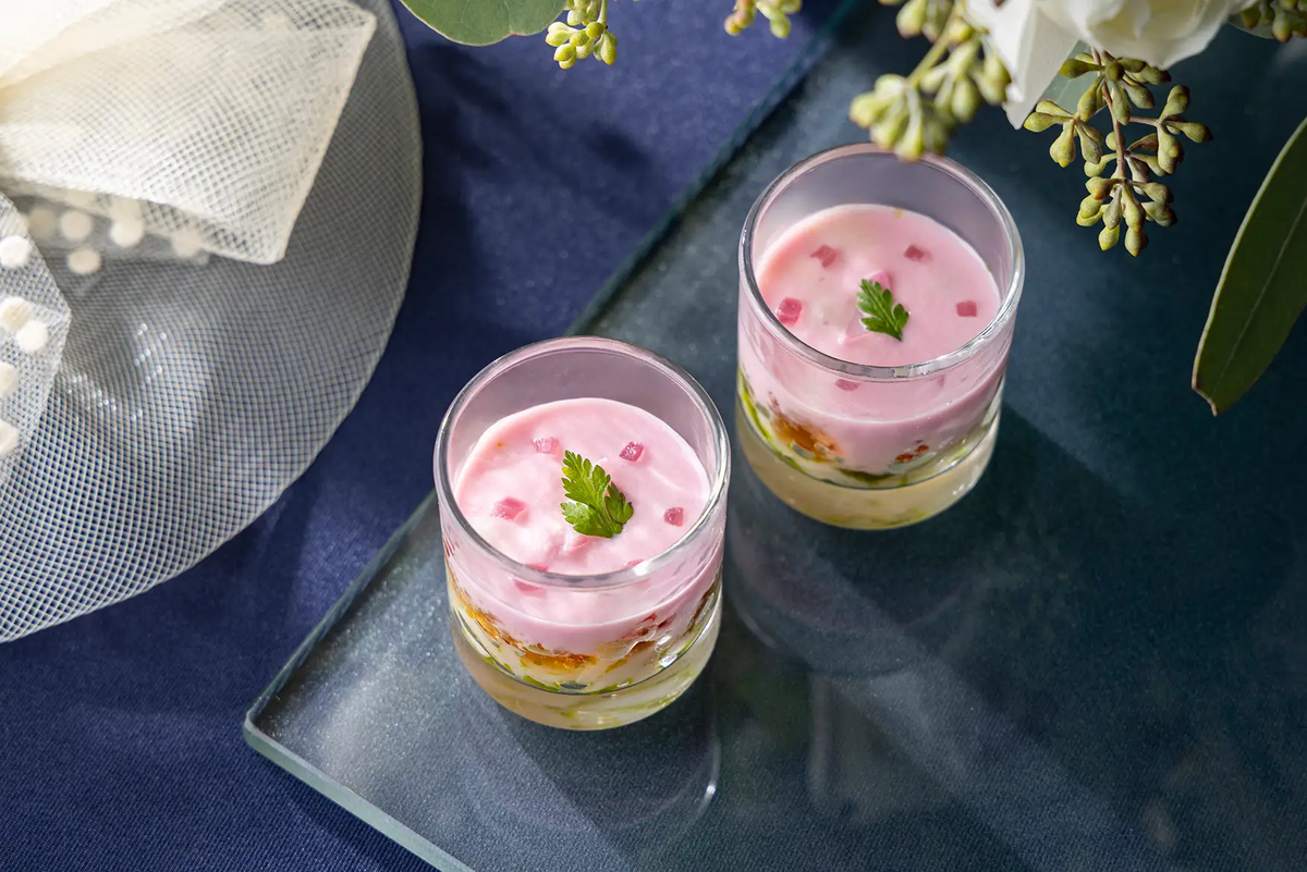 「ヴェリーヌ」とは、フランス発祥のグラスデザートやアペタイザー(前菜)の一種で、透明なグラスに層状に盛り付ける美しい料理。